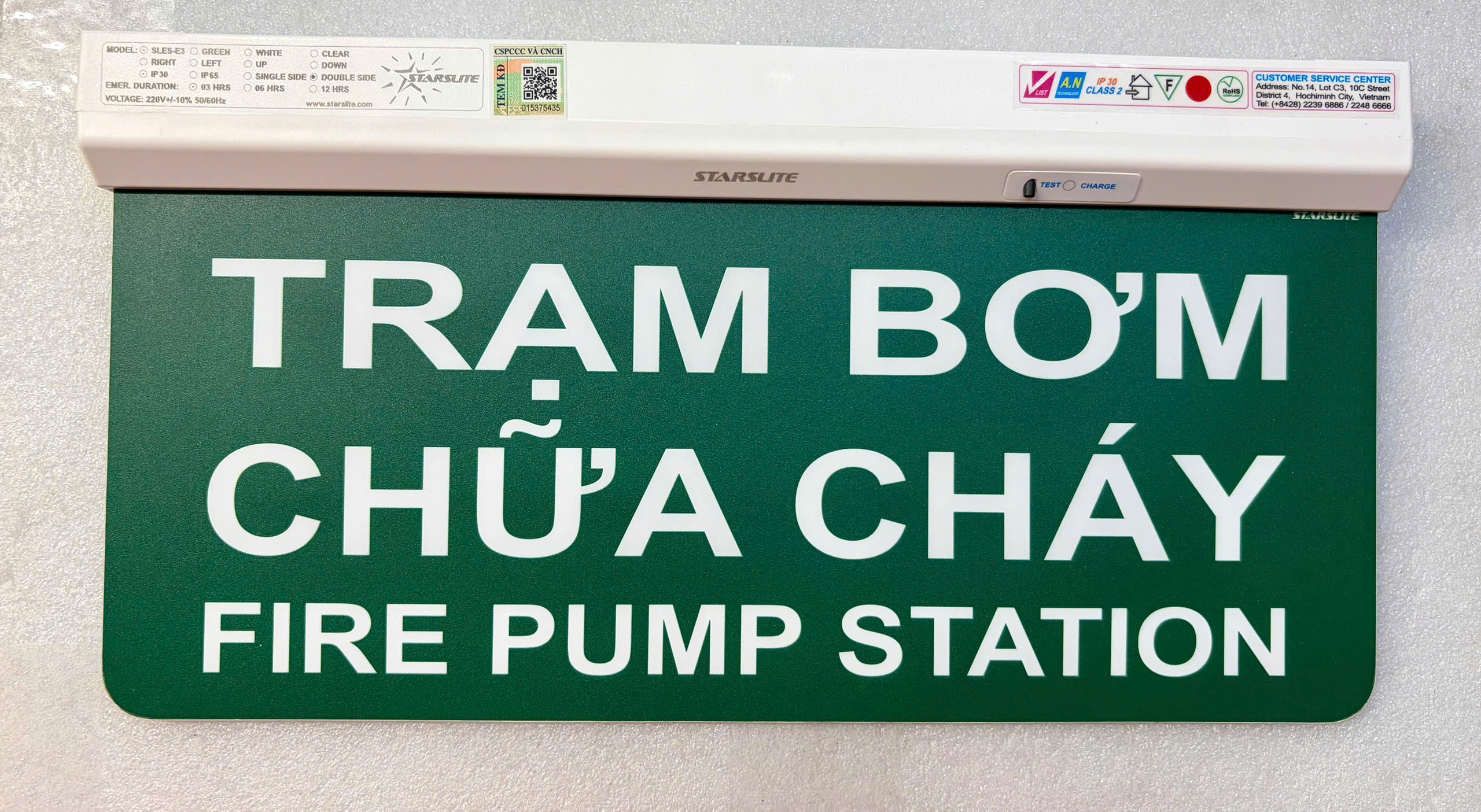 Đèn báo trạm bơm chữa cháy Starslite SLES-E3 1 mặt / 2 mặt dùng để báo trạng thái hoạt động của hệ thống bơm chữa cháy, giúp người vận hành và lực lượng PCCC nhận biết nhanh tình trạng hệ thống. Đèn báo sử dụng bóng LED siêu sáng hiển thị trạng thái bơm chữa cháy, tự động bật sáng liên tục khi có sự cố mất điện thêm 3 giờ. Đèn báo có mạch bảo vệ bình điện khi sạc đầy, tự động ngắt.
